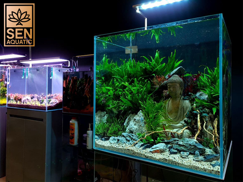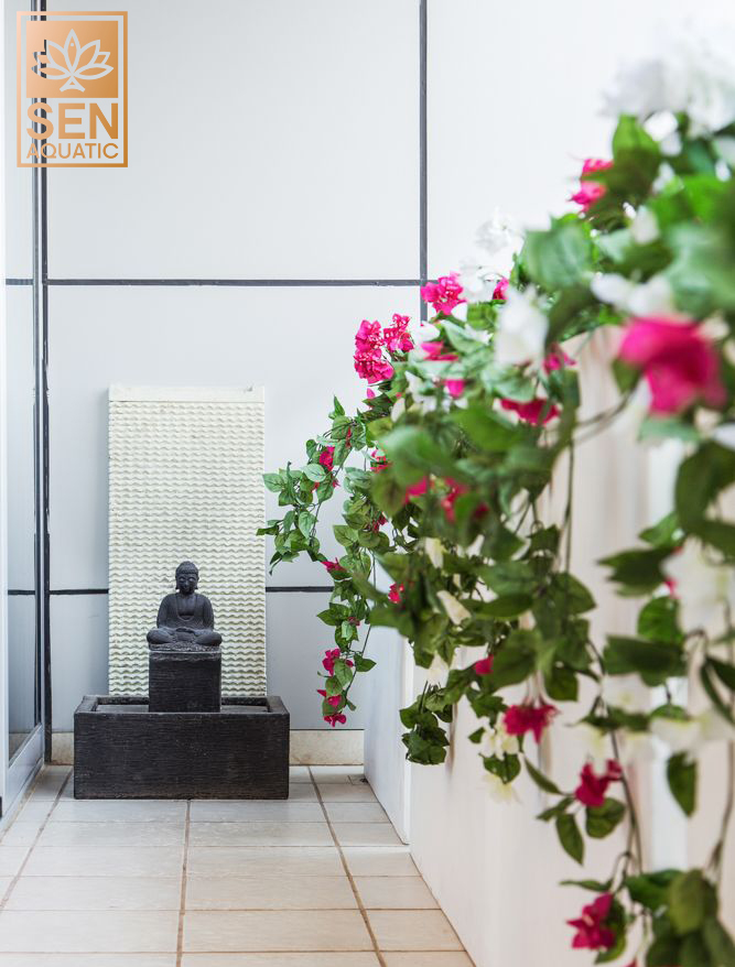 Khi kết hợp với bể thủy sinh, dòng chảy của nước kết hợp với sự tĩnh lặng của Đức Phật tượng trưng cho mức độ hài hòa giữa con người và vạn vật. Thiết kế bể Tĩnh Tại Tâm hiện đang là một trong những sản phẩm best-sellers tại Sen Aquatic, được nhiều gia chủ lựa chọn cho phòng khách.