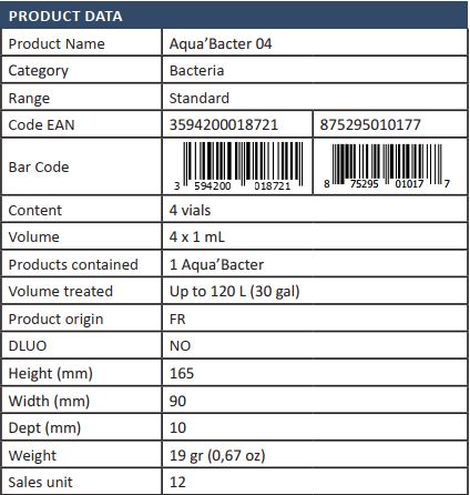 PRODIBIO Aqua'Bacter chứa các chủng vi khuẩn thanh lọc sống thích nghi với nước ngọt và lạnh. Sản phẩm giúp làm giảm nồng độ amoniac và nitrit có hại cho cá Betta, cá vàng và góp phần loại bỏ chất thải cùng thức ăn dư thừa trong bể cá.