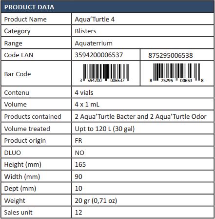Chất kết dính chứa trong Aqua'Turtle trung hòa mùi khó chịu bằng cách tiêu amoniac từ nitơ và giảm sự sản sinh nitrit.
