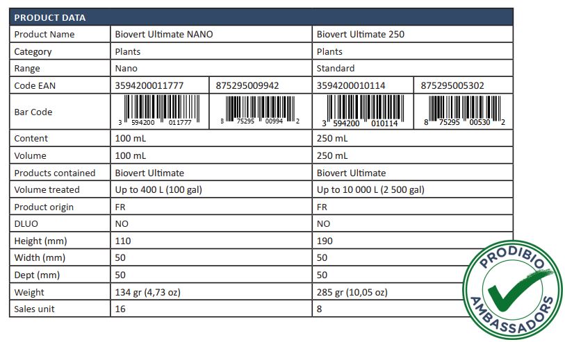 Biovert Ultimate chứa nồng độ nitrat, photphat và kali trong tỷ lệ tối ưu cho sự phát triển của cây thủy sinh. Được sử dụng luân phiên với Biovert Plus, Biovert Ultimate sẽ cung cấp cho cây thủy sinh tất cả các yếu tố cần thiết cho một sự tăng trưởng mạnh mẽ và một thảm thực vật tươi tốt.