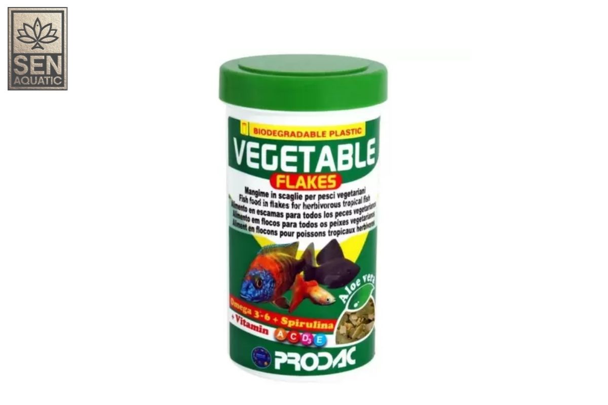 Thức ăn hỗn hợp dạng mảnh Prodac VEGETABLE Flake với hàm lượng bột thực vật cao được pha chế để đáp ứng nhu cầu dinh dưỡng của cá nhiệt đới ăn cỏ. Hiện sản phẩm đang được phân phối và bán lẻ tại hệ thống showroom Sen Aquatic.